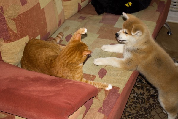 У нас кот до сих пор главный :2: Раньше он в доме гонял Тору, а на улице от нее удирал. А сейчас и на улице чуствует себя королем - может зайти в Торкин вольер и занять лучшее место в теньке. Ну а Торка уж где придется устраивается :2: