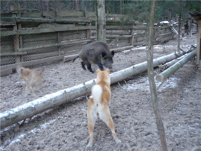 Приехали мы туда к 10 часам с тремя собаками. Один из нас бывалый охотник - знает там все и ездит туда постоянно. Ну а к нашему появлению с "япошками" отнеслись довольно-таки скептически - а они хоть лаять на зверя будут? Ну конечно, там все с драт- и куц-харами, лайками и тут мы все из себя такие красивые.... Тору сражу же запустили в загон в компании с лайкой. Вот они оторвались! Я наконец-то услышала как ЛАЕТ моя собака! Анкгара вела себя посмелее, побыстрее овсвоилась и стала подбегать к кабанихе, Тора держалась на расстоянии, но облаивала ее во всю глотку, потом и она осмелела. Как нам сказали, для первого раза соабаки показали себя очень достойно. Вообще-то и правильно, что не стали они "виснуть" на звере, т.к. это спокойная кабаниха, а вот если они в лесу встретят секача и "повиснут" на нем, то это может плохо закончится. Потом в загон вошла Сатоха, но ей кабан был совсем не интересен....в загоне стояла тишина, тогда егеря на подмогу послали Тору. Тора и без помощи Ангары показала себя с лучшей стороны.... А Сатохе, видимо, гора мяса вовсем ни к чему....